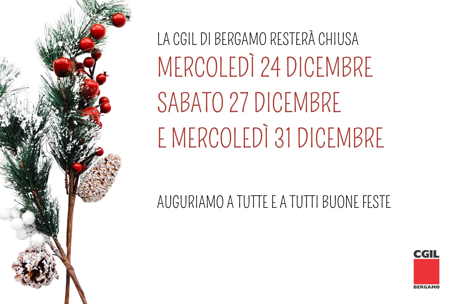 La CGIL di Bergamo resterà chiusa: mercoledì 24 dicembre, sabato 27 dicembre e mercoledì 31 dicembre